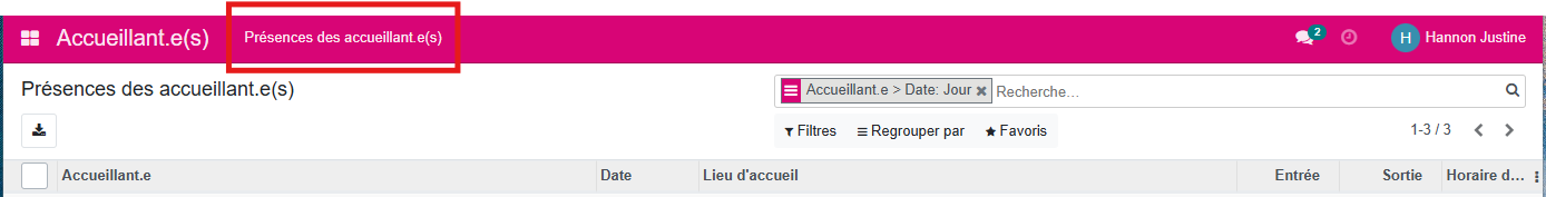 Il faut se rendre dans le menu Accueillant.e(s) > Présences des accueillant.e(s). Cette liste reprend toutes les présences de toutes les accueillantes.