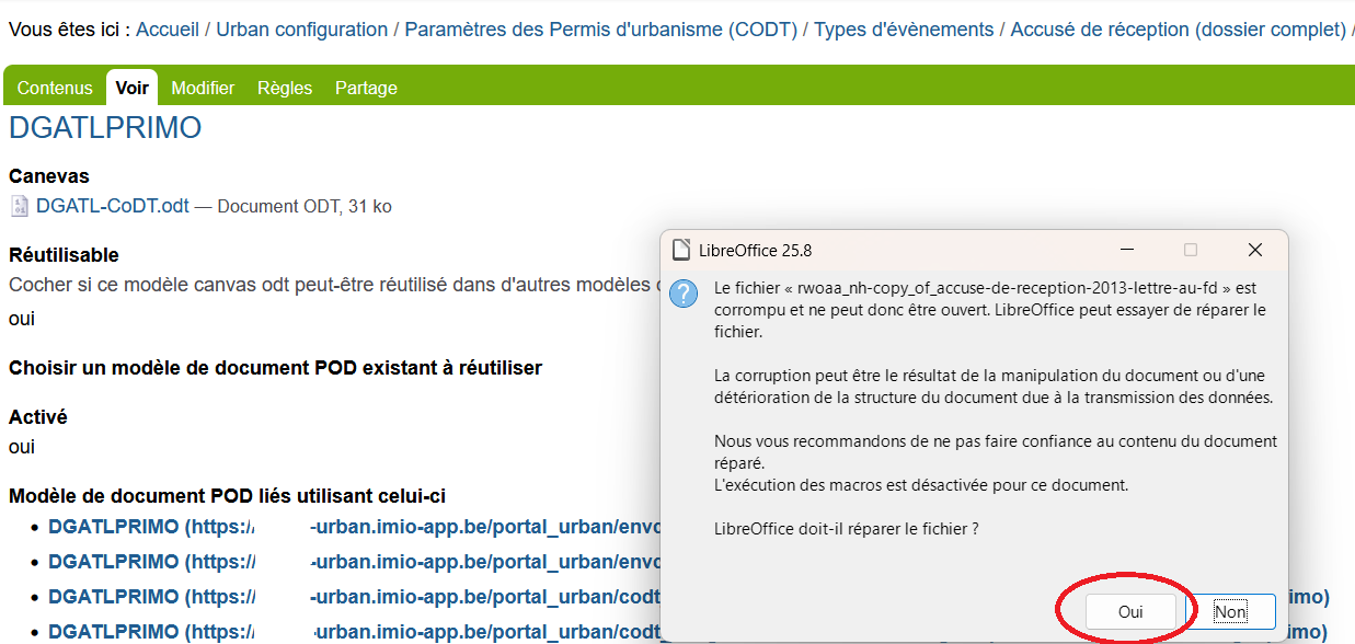 Le document nécessite une réparation : vous devez cliquer sur “Oui” du pop-up et il s’ouvrira. Enregistrez le alors sur votre ordinateur et vérifiez que les champs de fusion proposés correspondent à ceux disponibles dans le fichier mis à disposition disponible ici :