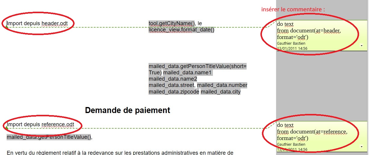 Créer un commentaire (insert –> comment) lié à ce rectangle dans lequel vous indiquez : do text from document (at=nom-du-modèle-a-fusionner, format=‘odt’)