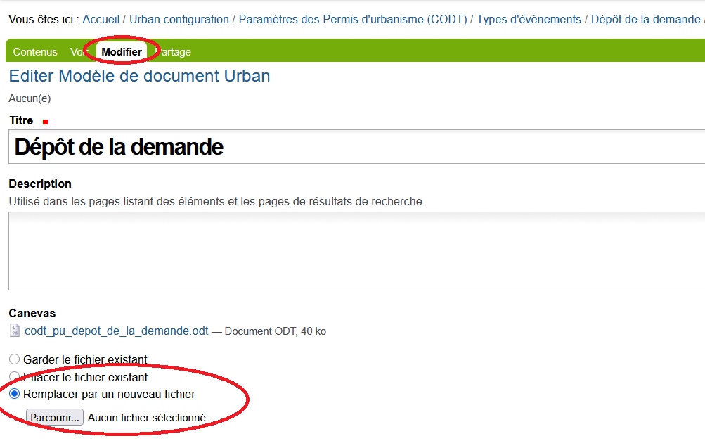 Pour utiliser un modèle spécifique à une demande, le rajouter dans la page de la demande (ajout d’un élément -> UrbanTemplate). Attention, le modèle de base ne sera plus utilisé.