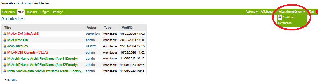 A noter qu’il est possible d’importer une liste d’architectes et autres à partir d’un fichier csv. Pour ce faire, veuillez-vous adresser à votre administrateur du logiciel.