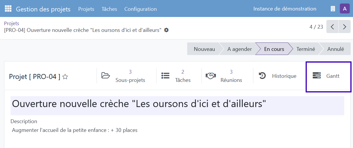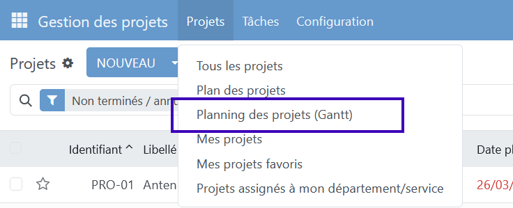 du module Gestion des projets - Menu “Projets” - Sous-menu “Planning des projets (Gantt)”