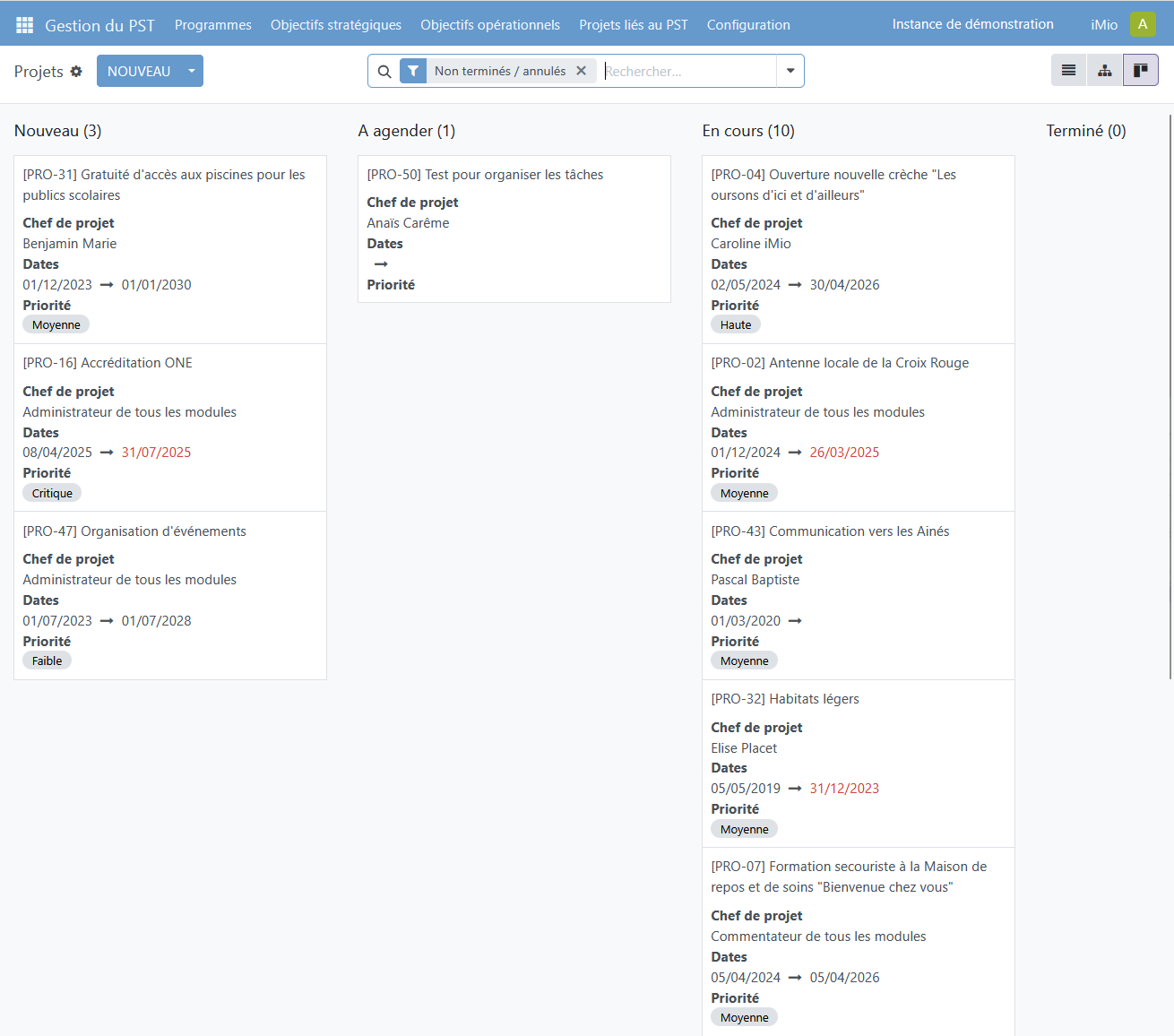 Cette vue est appliquée par défaut quand on clique sur le module Gestion du PST. Elle est également disponible à partir des sous-menus “Plan du programme actif” dans le module Gestion du PST et “Plan des projets” dans le module Gestion des projets.