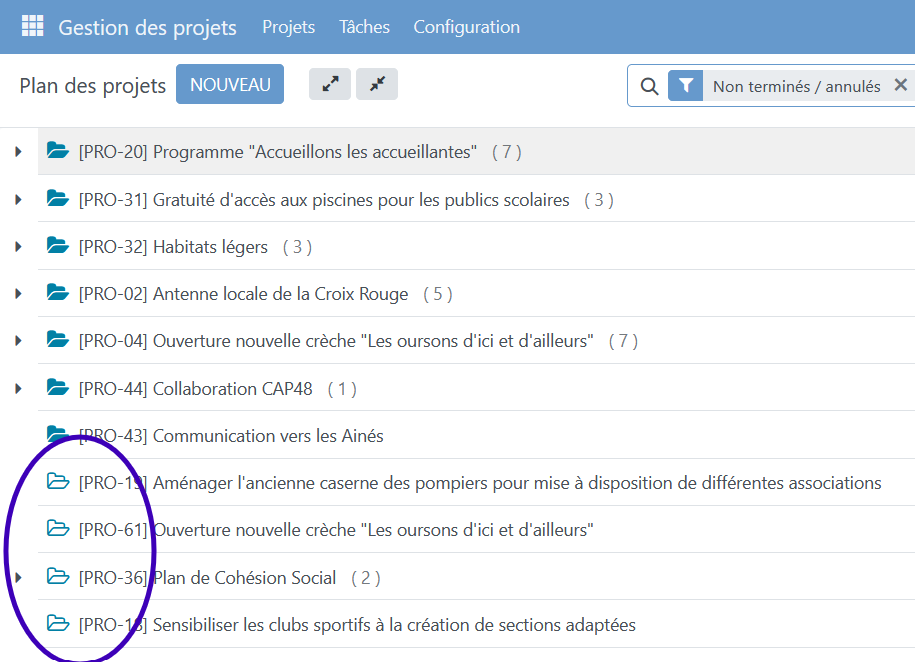 Sur les différentes vues, seuls les objets NON TERMINES/ANNULES sont présentés par défaut.