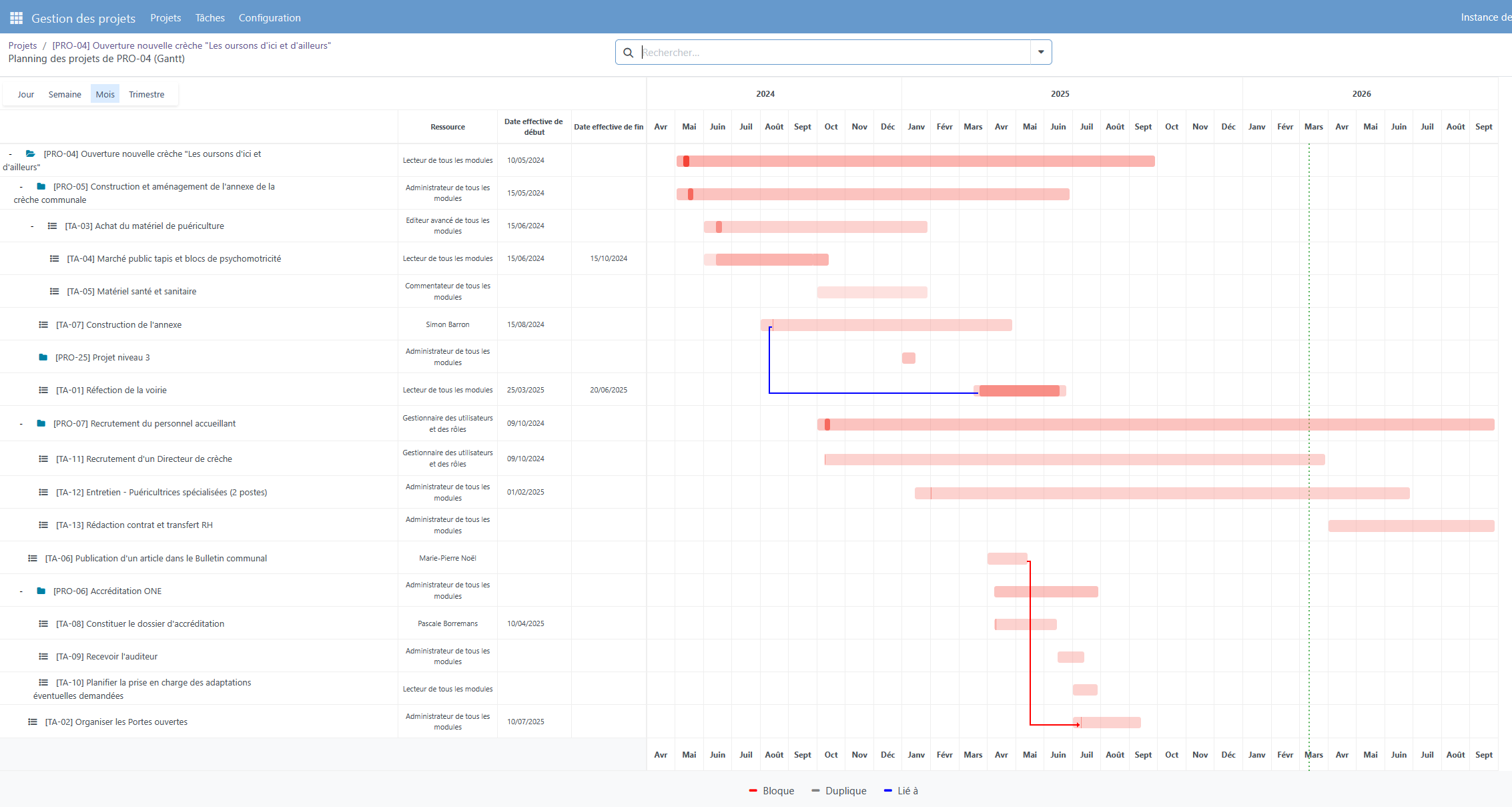 Tout utilisateur avec le role de lecteur, rôle global ou local a accès à la vue Gantt. Celle-ci permet de visualiser les différentes activités de l’organisation et leur planification. Elle permet également d’en évaluer l’avancement, d’anticiper les impacts d’un retard sur les autres activités et d’affecter/gérer les ressources associées à ces activités (humaines, matérielles, financière,…).
