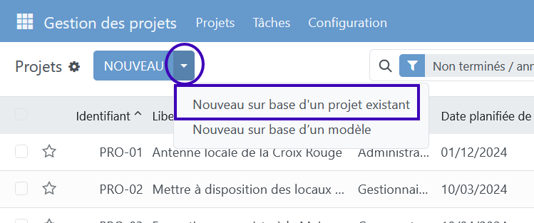 Bouton NOUVEAU SUR BASE D’UN PROJET EXISTANT