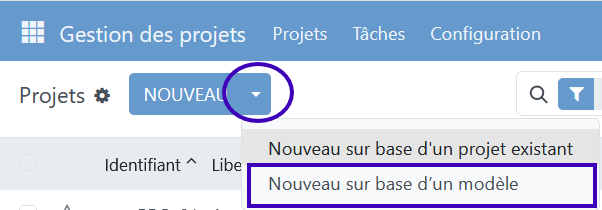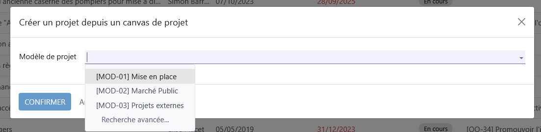 Cette fonctionnalité est disponible si des modèles de projet ont été créés et enregistrés par les administrateurs. Cfr Création d’un modèle de projets