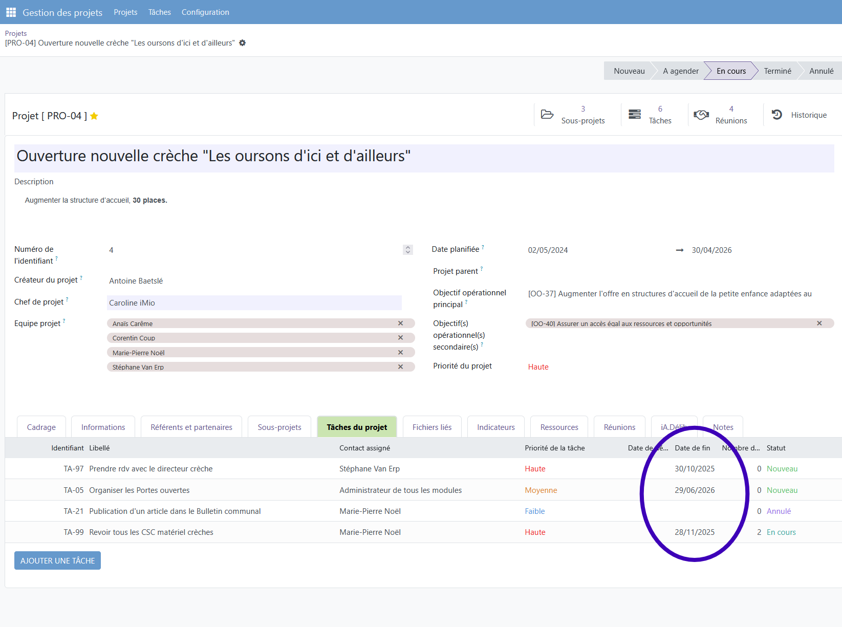 Affichage de la date de fin d’une tâche ou d’un projet dans les tableaux de bord des vues liste des “Projets” et des “Tâches”.