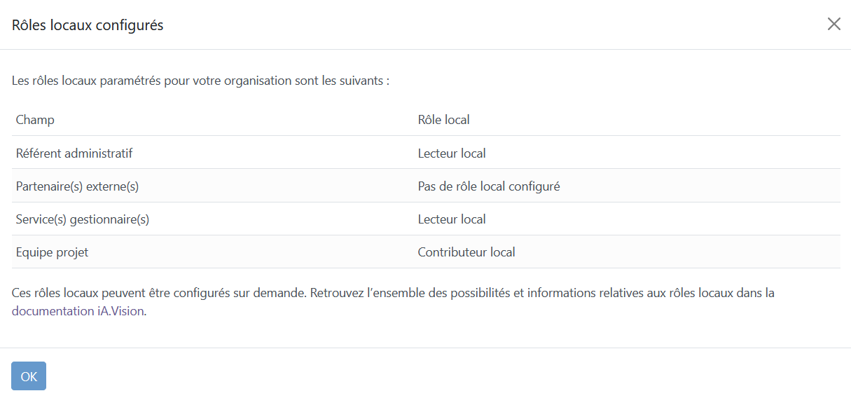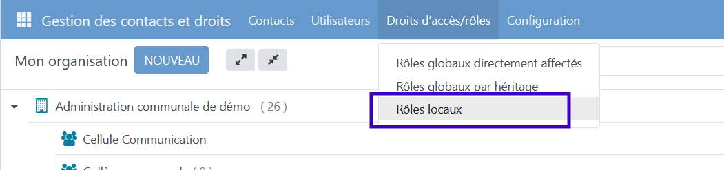 Ajout d’un nouveau menu dans le module Gestion des contacts et droits qui permet aux administrateurs de visualiser la configuration des rôles locaux paramétrables.