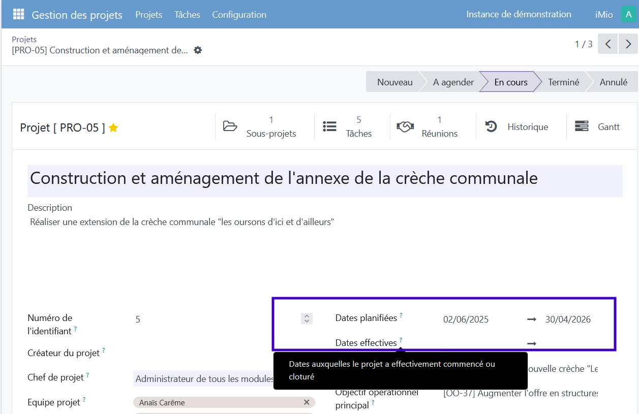 Améliorations apportées à la configuration des formulaires de projets et tâches, suite à la mise à disposition de la vue Gantt (ajout des dates effectives/planifiées).