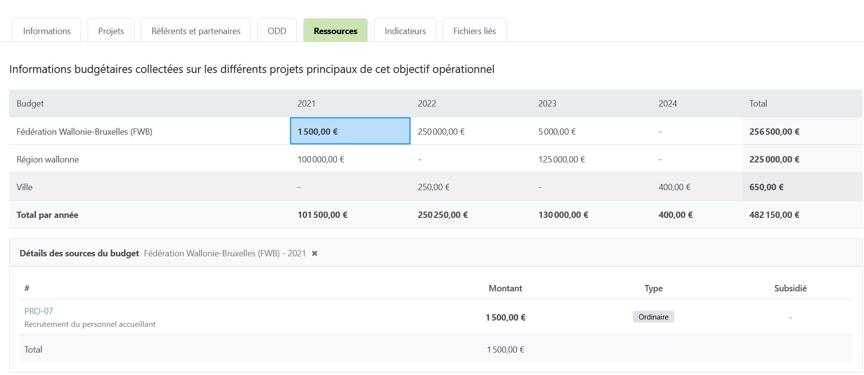 cliquer sur les valeurs du tableau affiche les (sous-)projets contribuant à ce montant