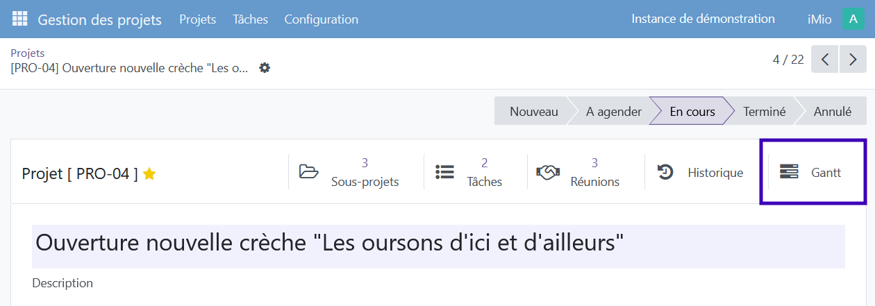 Ajout d’une vue de planification des projets (diagramme de Gantt), accessible depuis un bouton raccourci (smartbutton).