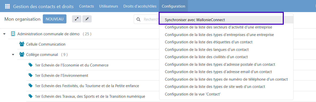 Module Gestion des contacts et droits, menu « Configuration, sous-menu “Synchroniser avec Wallonie Connect”